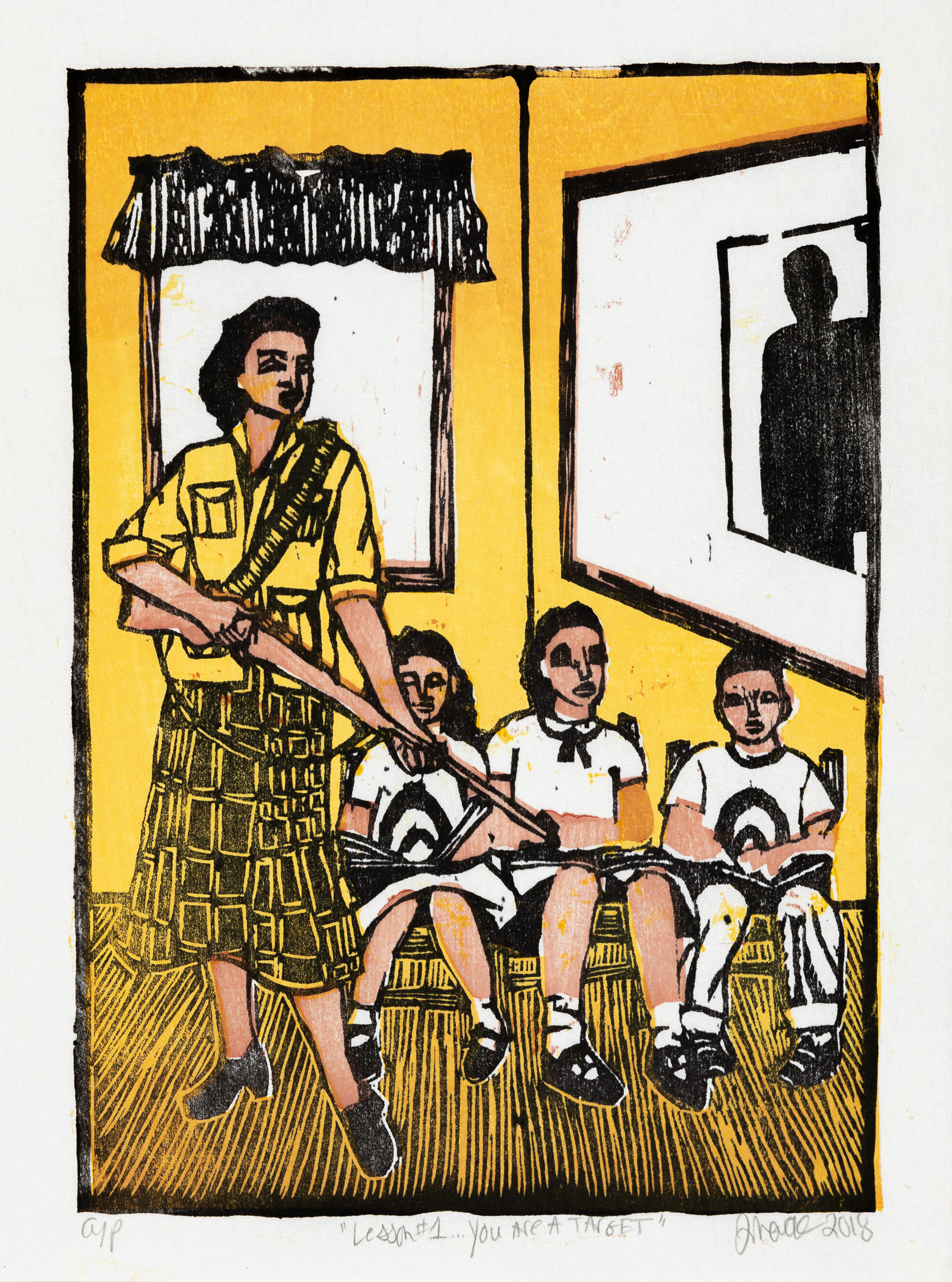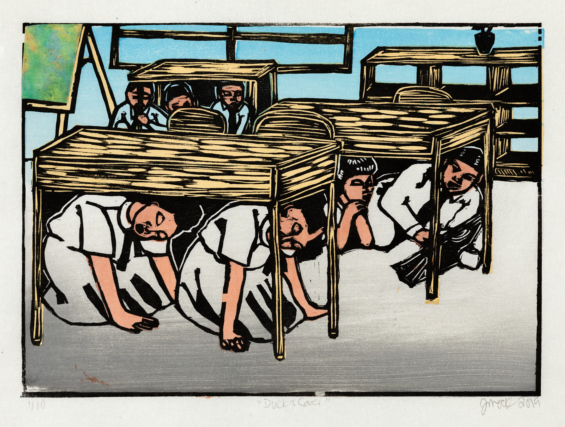 Jennifer Mack- Watkins Duck and Cover 2019 9 x 12” mokuhanga